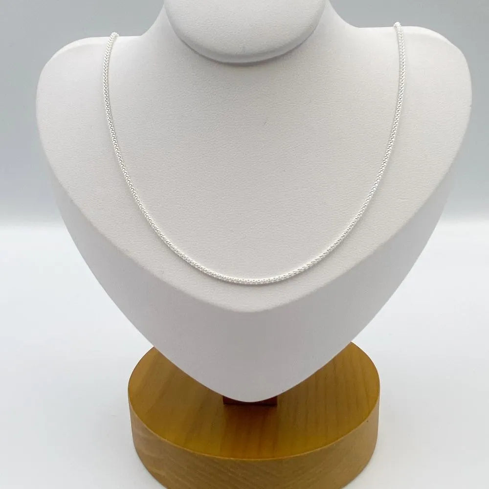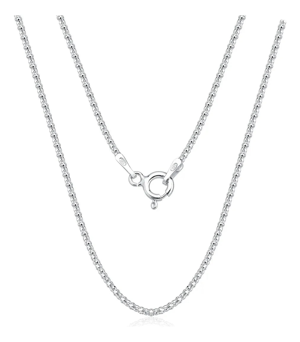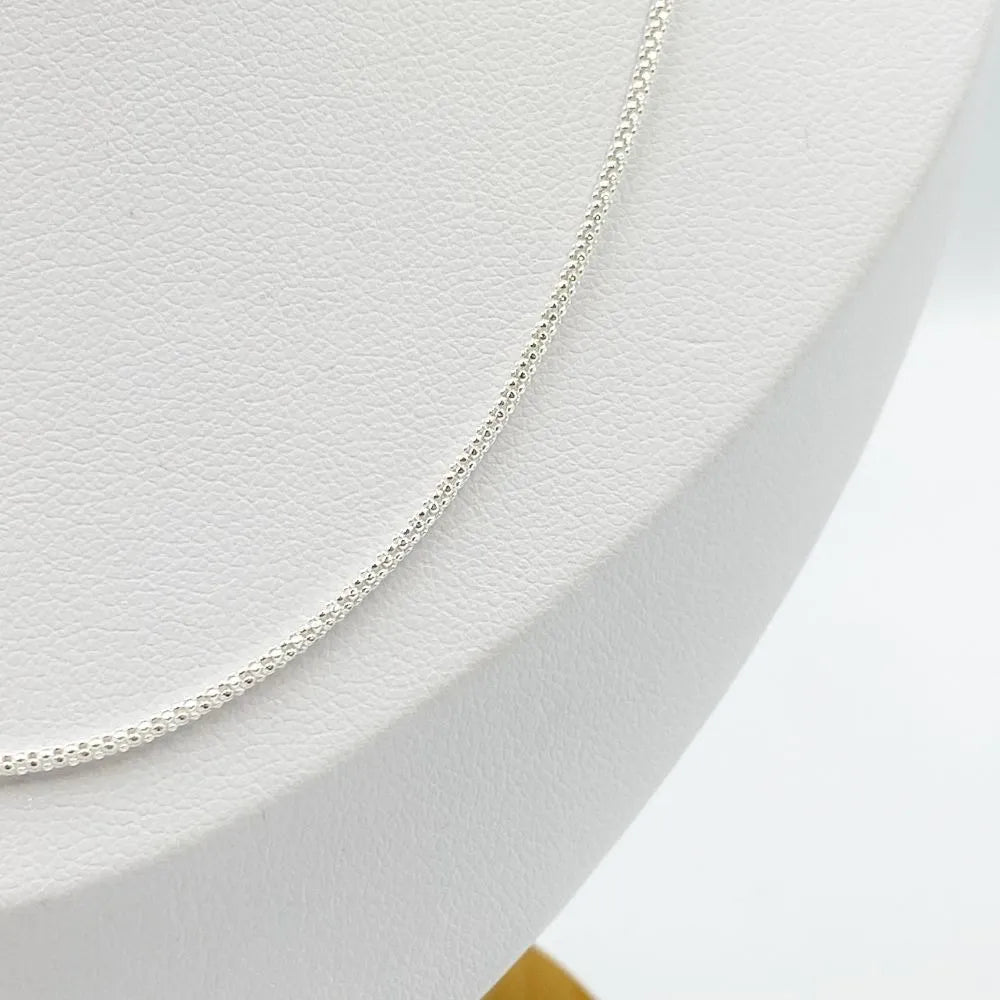 Corrente Pipoca Diamantada Prata 925 Detalhes e especificações: Esta corrente é confeccionada em Prata 925, um material de alta qualidade que realça o brilho dos detalhes diamantados. Com uma largura de 1mm, esta corrente é delicada e pode ser usada em diversas ocasiões. Disponível em diferentes comprimentos para encontrar a que melhor se adapta ao seu estilo.